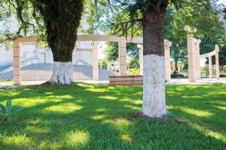 Prefeitura de Califórnia realiza pintura de troncos de árvores na praça da igreja matriz