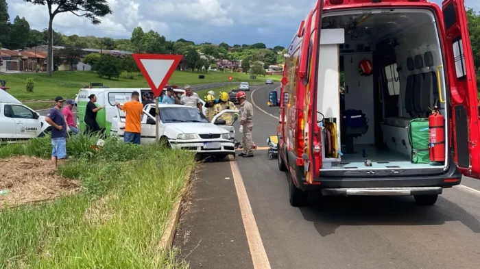Três pessoas ficaram feridas em um acidente registrado no final da manhã deste sábado (15) no trevo de acesso a Cambira. A colisão envolveu um veículo VW Saveiro e um Fiat Palio.