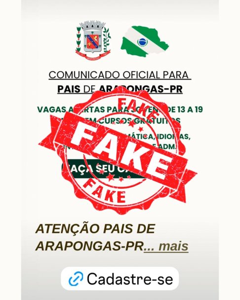 Conforme divulgado, qualquer oportunidade promovida pela Prefeitura de Arapongas, ou em parceria, será informada exclusivamente pelos meios institucionais. Publicações que não constem nesses perfis não são validadas pela administração municipal.