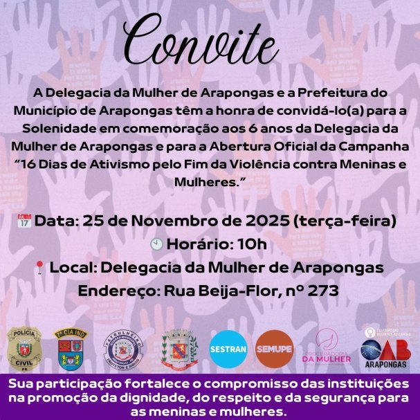 Arapongas dará início no dia 25 à campanha “16 Dias de Ativismo pelo Fim da Violência contra Meninas e Mulheres” com uma solenidade que também comemora os seis anos da Delegacia da Mulher no município. A cerimônia está marcada para as 10h00 e é aberta à população.