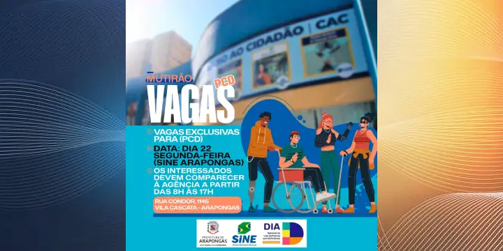 A Prefeitura de Arapongas, por meio das Secretarias de Desenvolvimento, Inovação, Trabalho e Renda (Semude) e da Mulher e da Pessoa com Deficiência (Semupe), promove um mutirão de vagas de emprego exclusivas para Pessoa com Deficiência (PCD). A ação será na segunda-feira, 22, das 08h00 às 17h00, na Agência do Trabalhador (Rua Condor, nº 1145 – Vila Cascata).
