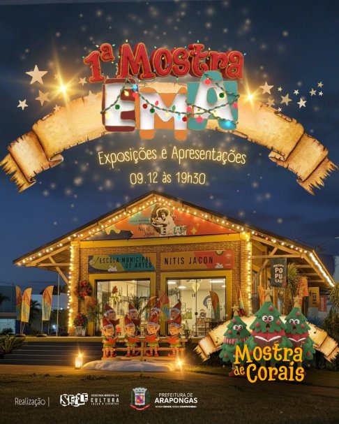 Arapongas promove nesta terça-feira, 09, às 19h30, a 1ª Mostra da Escola Municipal de Artes Nitis Jacon (EMA), marcando o encerramento de um ciclo criativo com exposições e apresentações dos alunos. A iniciativa da Prefeitura, por meio da Secretaria Municipal de Cultura, Lazer e Eventos (SECLE), convida toda a comunidade a prestigiar o evento.
