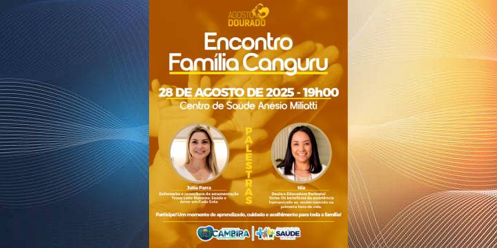 No próximo dia 28 de agosto de 2025, às 19h, o Centro de Saúde Anésio Miliatti será palco do Encontro Família Canguru, em alusão ao Agosto Dourado, mês dedicado à conscientização sobre a importância do aleitamento materno.