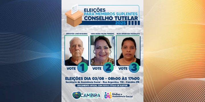 cidade de Cambira se prepara para mais uma importante etapa da participação cidadã: as eleições para escolha dos membros suplentes do Conselho Tutelar. A votação acontece no próximo dia 03 de agosto (sábado), das 08h às 17h, na Secretaria de Assistência Social, localizada na Rua Argentina, nº 110.