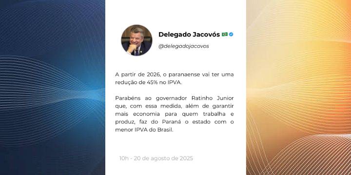 O Paraná terá o menor Imposto sobre a Propriedade de Veículos Automotores (IPVA) de todo o Brasil a partir de 2026.