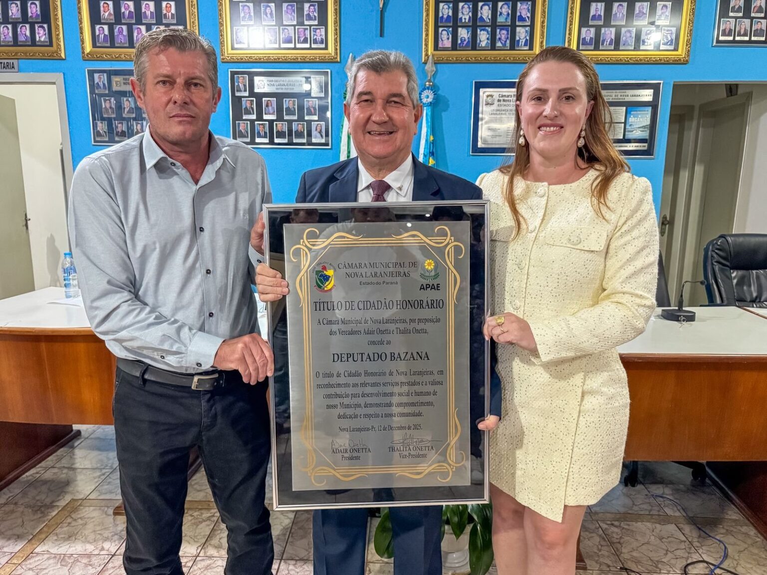 Em Sessão Solene na Câmara de Vereadores, o deputado estadual Pedro Paulo Bazana (PSD) recebeu, nesta sexta-feira (12), o Título de Cidadão Honorário de Nova Laranjeiras. A homenagem reconhece o trabalho desenvolvido pelo parlamentar em defesa do município.
