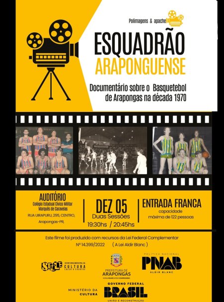 A Prefeitura de Arapongas, por meio da Secretaria da Cultura, Lazer e Eventos (SECLE), estreia nesta sexta-feira, 05, o documentário “Esquadrão Araponguense”, que resgata a história do lendário time de basquete da década de 1970. Serão duas sessões gratuitas, às 19h30 e 20h45, no auditório do Colégio Estadual Cívico Militar Marquês de Caravelas.