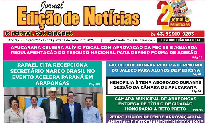 ArapongasEdições Impressas Edição Impressa 477 Publicado em: 11 de setembro de 2025 Compartilhar Compartilhar Veja Nossa Nova Edição Impressa Clique na imagem abaixo para ler online Edição Anteriores – Clique Aqui Mostra SOU ARTE reúne 600 jovens em evento cultural gratuito em Arapongas Projeto gratuito vai oferecer R$ 1.500,00 para 3 empreendedores em Arapongas Equipe mirim de Ginástica Rítmica de Arapongas participa de torneio em Cambé Arapongas confirma 1.408 casos de dengue e sete de chikungunya Prefeito de Arapongas Rafael Cita, esclarece dúvidas a respeito da Reforma da Previdência Compartilhar este Artigo Facebook WhatsApp WhatsApp E-mail Imprimir Compartilhar Fique por dentroAcompanhe nas redes sociais 6.7milSeguidoresCurtir1.8milSeguidoresSeguirWhatsAppSeguir Mais lidas Arapongas Arapongas soma 1.412 casos de dengue e alerta população após chuvas sergio 11 de dezembro de 2025 Jandaia do Sul apresenta projeto para pavimentação de estradas rurais Arapongas registra quatro furtos em diferentes bairros em um dia Mãe e filha são agredidas durante discussão familiar em Arapongas Pedro Lupion recebe prêmio como um dos parlamentares mais influentes do Brasil
