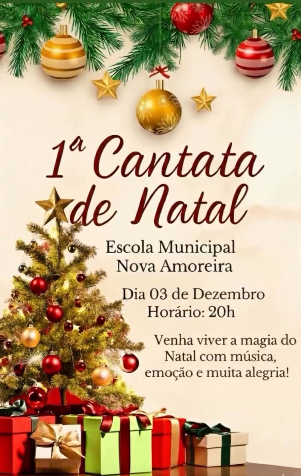 1° Cantata de Natal de Nova Amoreira — com alunos da Escola Municipal de Nova Amoreira. Data: 3/12 (quarta-feira). Horário: 20h. Local: salão da igreja do Distrito de Nova Amoreira.