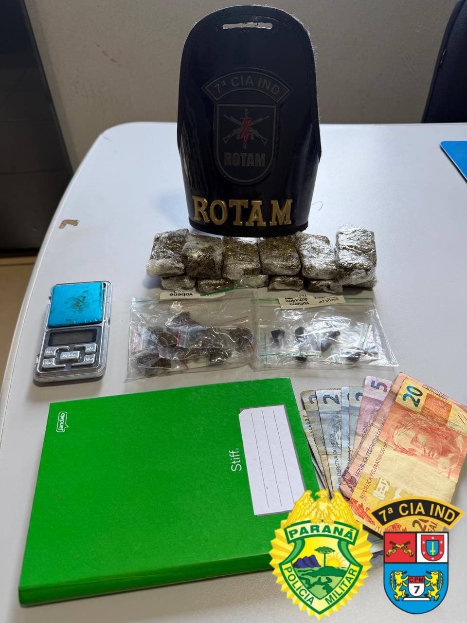 No imóvel, foram encontradas outras porções de substância análoga à maconha, porções de substância análoga a haxixe (“ice”), uma balança de precisão e um caderno com anotações. Diante do material apreendido, o indivíduo recebeu voz de prisão.