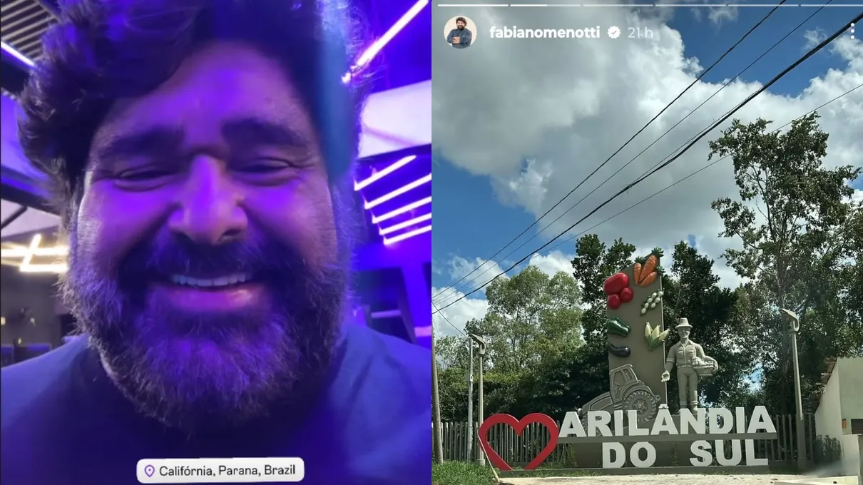 A primeira imagem, realizada na cidade de Marilândia do Sul, foi registrada nesta quarta-feira (19). Na foto é possível ver o novo portal da cidade. A prefeitura do município repostou o registro do cantor nas redes sociais e comemorou: “O novo portal de Marilândia do Sul, no Leão do Norte, chamou a atenção do cantor Fabiano Menotti, da dupla sucesso nacional, César Menotti e Fabiano. O cantor, ao passar pela cidade, publicou uma foto do portal em seu Instagram. O portal, que faz uma homenagem aos produtores rurais, será ainda inaugurado, mas vem chamando a atenção pela beleza. Assim como o famoso cantor, muitas pessoas já estão aproveitando para tirar lindas fotos”.