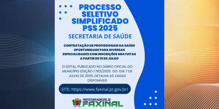 A Secretaria Municipal de Saúde de Faxinal informa a abertura do edital de Processo Seletivo Simplificado (PSS), destinado à contratação de 26 profissionais por prazo determinado, para atender necessidade temporária e excepcional de interesse público. O edital também conta com cadastros reservas.