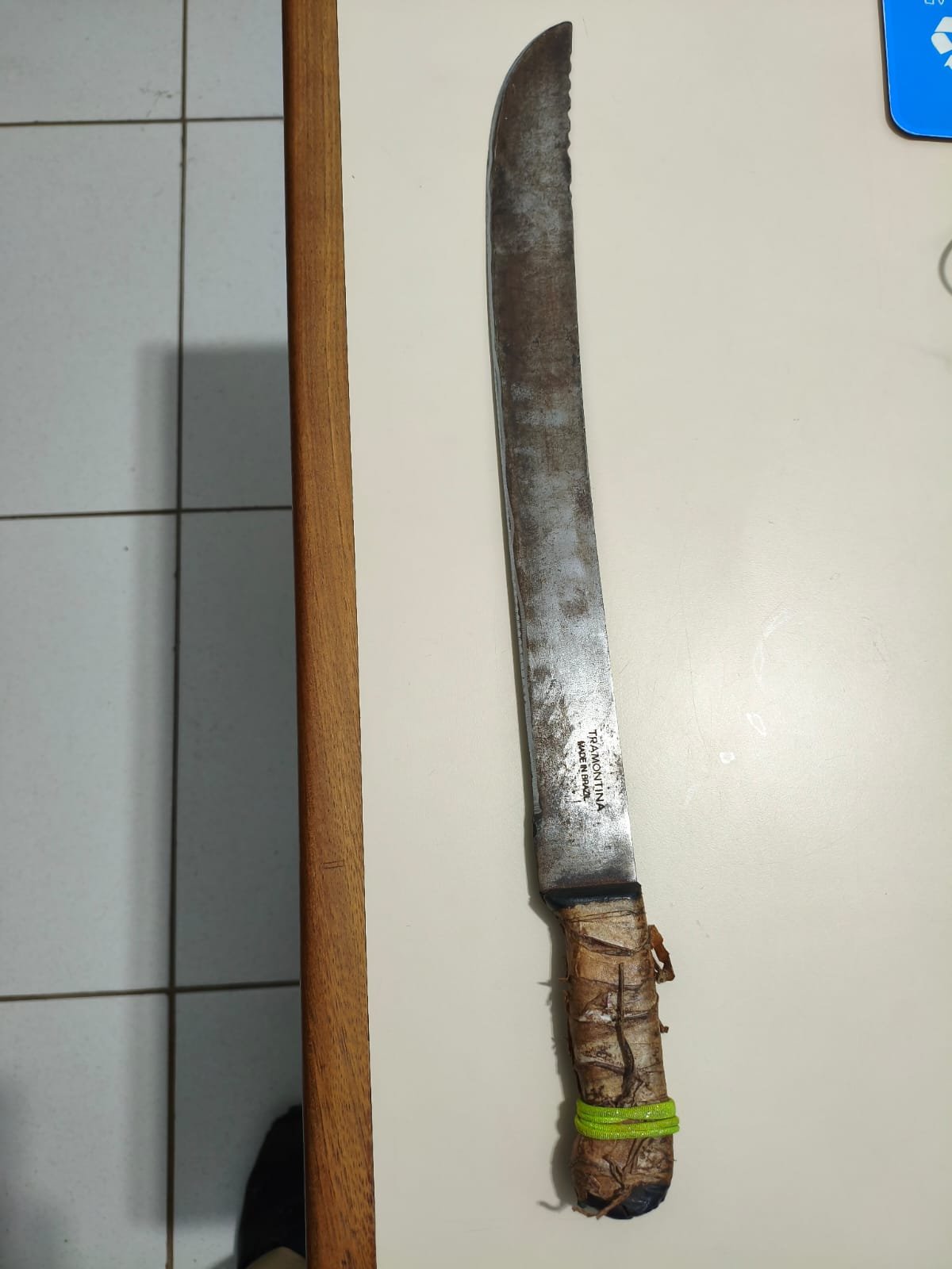 Enquanto a equipe colhia informações, o suspeito passou pelas proximidades e foi prontamente reconhecido pela vítima. Os policiais realizaram a abordagem e localizaram um facão de grande porte na cintura do homem, identificado como o objeto utilizado na agressão.
