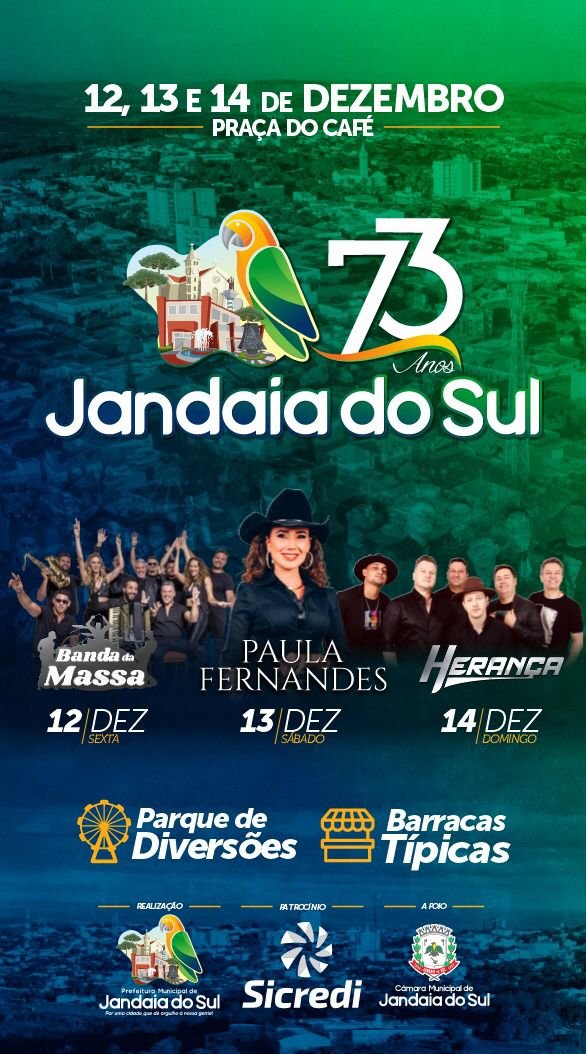 Jandaia do Sul comemora 73 anos com três dias de festa na Praça do Café. A programação, divulgada pela Prefeitura Municipal, acontece de 12 a 14 de dezembro e reúne shows, apresentações culturais e momentos de fé, além de parque de diversões e barracas típicas de entidades locais.
