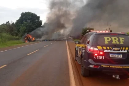 Dois caminhões e uma van pegam fogo em grave acidente na BR-369