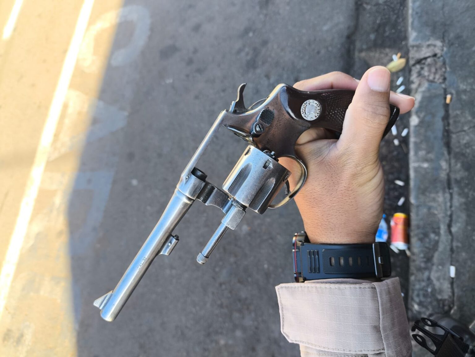 Na busca pessoal de um dos homens, os policiais localizaram duas cápsulas deflagradas de calibre .32 no bolso direito. Já no interior do estabelecimento, durante varredura, foi encontrado um revólver Taurus calibre .32, cor prateada, em uma caixa de papelão com garrafas vazias, municiado com quatro cartuchos (dois intactos e dois picotados).