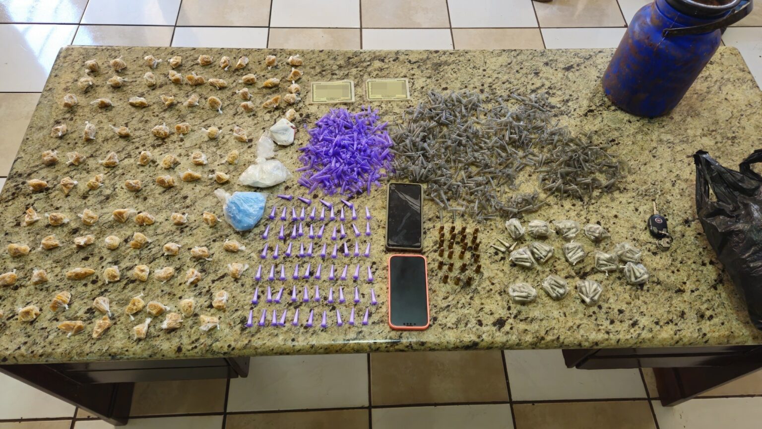 Na sequência, os militares localizaram um recipiente enterrado na mata próxima, que continha 435 gramas de crack, três porções grandes de cocaína, dezenas de eppendorfs cheios e vazios, além de 23 munições intactas, calibre 9 mm.