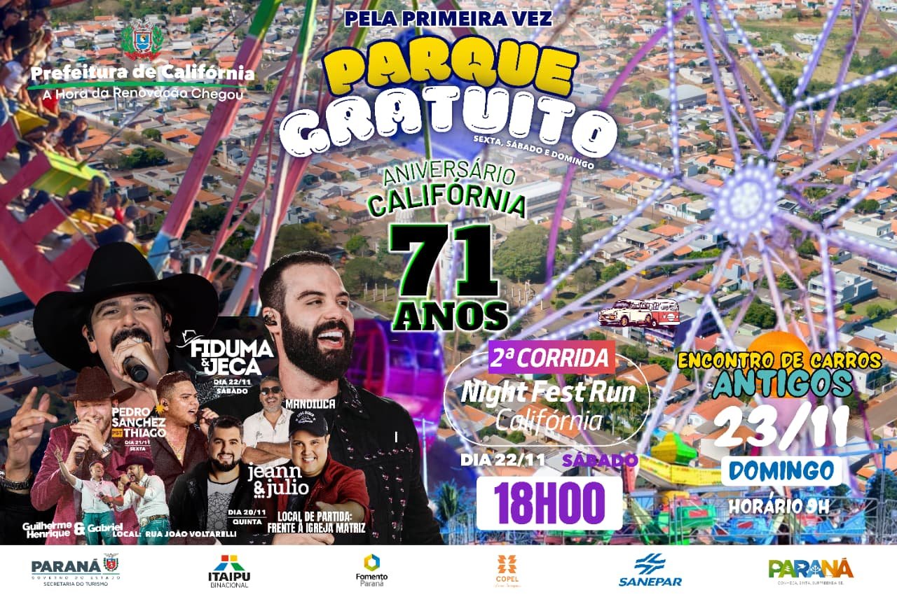 Pela primeira vez na história de Califórnia, a tradicional festa da cidade vai contar com um parque de diversões totalmente gratuito. O anúncio foi feito pelo prefeito Paulo da Padaria na noite desta sexta-feira, 14 de novembro, uma semana antes do início das festividades.