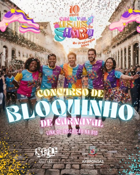 A Prefeitura de Arapongas abriu as inscrições para o concurso de blocos carnavalescos da 10ª edição do Carnaval “Nas Asas do Samba”, que será realizada em fevereiro de 2026. Cada bloco deve ter, no mínimo, 15 integrantes.