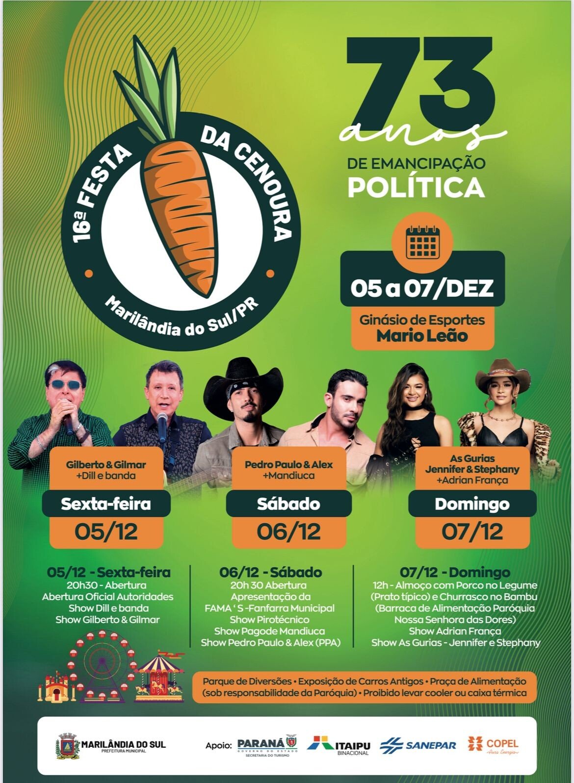 Shows sertanejos, fanfarra e gastronomia típica vão marcar a 16ª Festa da Cenoura de Marilândia do Sul, que celebra os 73 anos de emancipação política do município. Conforme a prefeitura, o evento acontece de 5 a 7 de dezembro, com abertura oficial na sexta-feira, às 20h30.