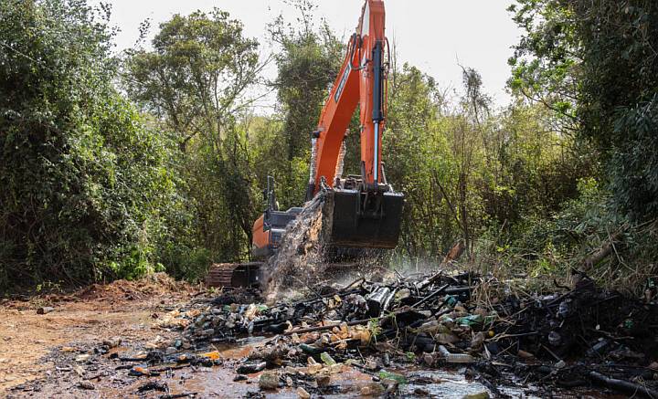 O local onde o lixo estava acumulado fica na Estrada do Turco, na região do Parque Industrial Galan. O trabalho envolveu equipes das secretarias de Meio Ambiente e de Serviços Públicos, com apoio de caminhões e escavadeira hidráulica.
