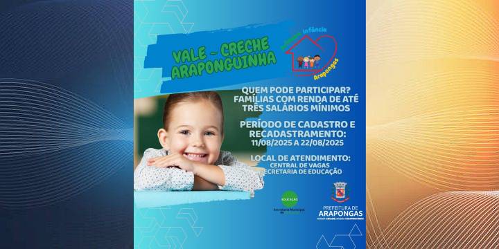 A Prefeitura de Arapongas, por meio da Secretaria de Educação, informa que o Projeto Vale Creche Araponguinha vai iniciar o recadastramento da fila de espera dos Centros Municipais de Educação Infantil (CMEIs). A iniciativa é um dos compromissos de campanha do prefeito Rafael Cita, e é voltada para crianças de 0 a 3 anos de famílias com renda até três salários-mínimos. “Continuamos trabalhando firme para que todas as crianças de Arapongas possam ter um lugar digno para estudar e garantir que os pais possam sair tranquilos para trabalhar”, destaca o prefeito.
