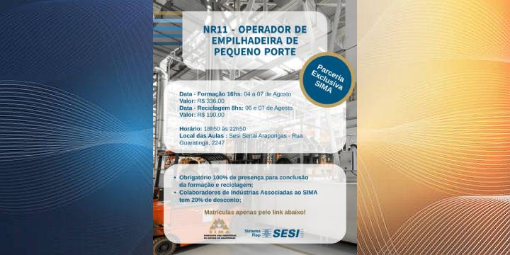A Prefeitura de Arapongas, por meio da Secretaria Municipal de Desenvolvimento, Inovação, Trabalho e Renda (Semude) divulga que estão abertas as matrículas para o curso de Operador de Empilhadeira de Pequeno Porte, que se inclui na Norma Regulamentadora (NR) nº 11, e foi intermediada pela Semude junto ao Sindicato das Indústrias de Móveis de Arapongas (SIMA).