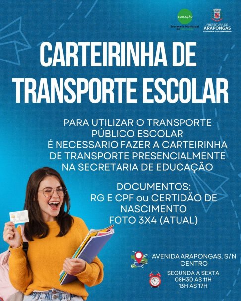 Em Arapongas, a carteirinha de transporte escolar passa a ser obrigatória para estudantes das redes municipal e estadual. Pais e responsáveis devem providenciar o documento; quem já possui a carteirinha precisa atualizar o cadastro caso esteja vencido.