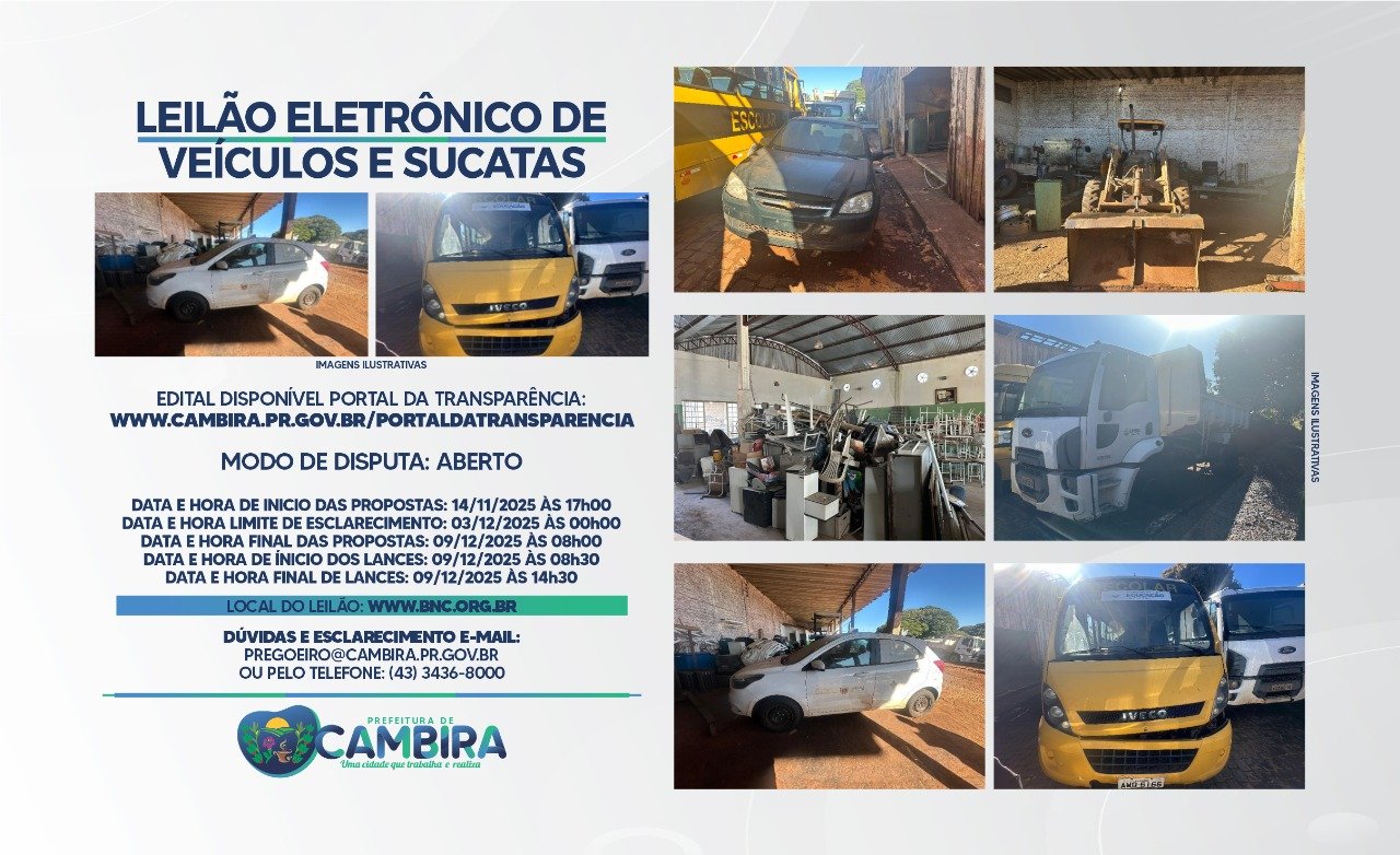 O leilão será realizado no endereço: https://bnc.org.br/. Dúvidas e pedidos de esclarecimentos devem ser enviados para o e-mail: pregoeiro@cambira.pr.gov.br.