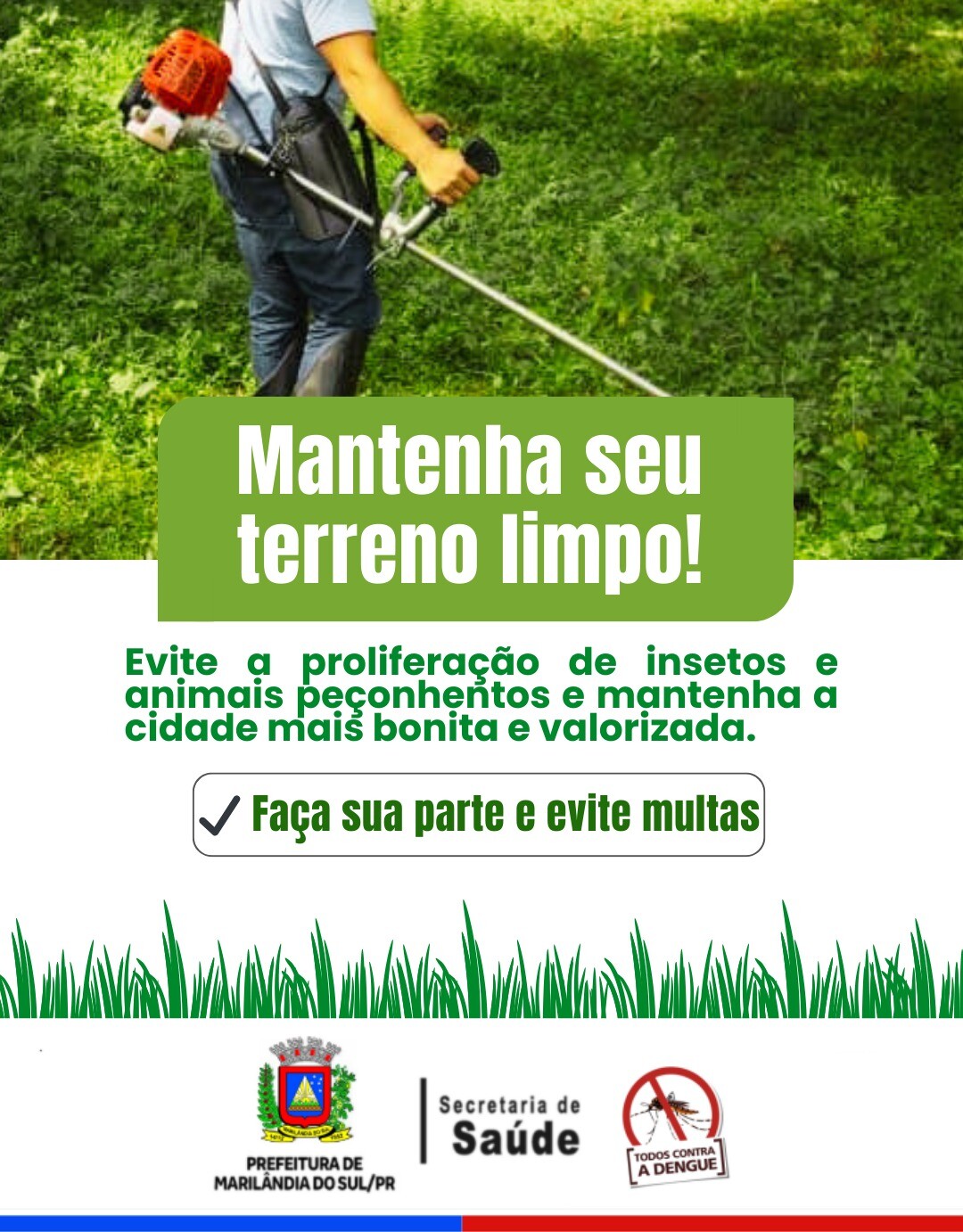 Prazo de 5 dias e multa de até R$ 3.990,00: a Prefeitura de Marilândia do Sul reforça a orientação para que moradores mantenham a limpeza e a roçagem de quintais e terrenos em dia, em esforço conjunto para reduzir riscos à saúde pública.