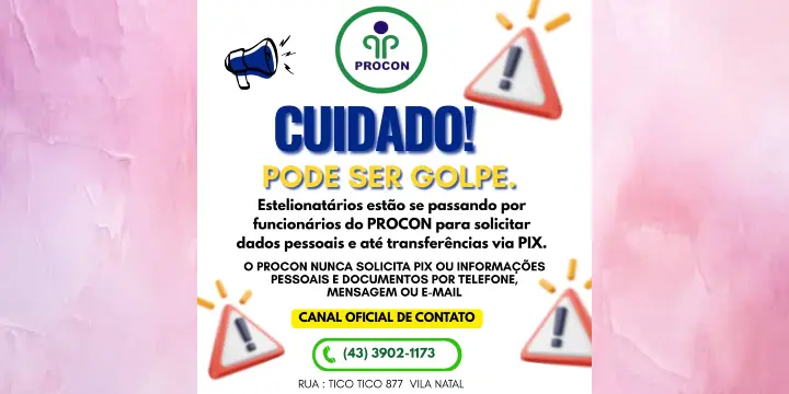 O Núcleo Municipal de Proteção e Defesa do Consumidor (Procon) de Arapongas alerta a população que não solicita dados pessoais e nem transferências via Pix por meio de mensagens, por telefone ou e-mail.