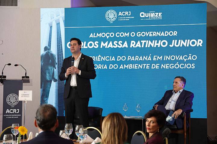 O governador Carlos Massa Ratinho Junior apresentou nesta sexta-feira (25) os avanços alcançados pelo Paraná em setores estratégicos para o crescimento do Estado, como infraestrutura, economia e desenvolvimento urbano. Ele participou do painel “A experiência do Paraná em inovação e melhoria do ambiente de negócios”, um encontro com lideranças empresariais e gestores públicos na Associação Comercial do Rio de Janeiro (ACRJ), na capital fluminense.
