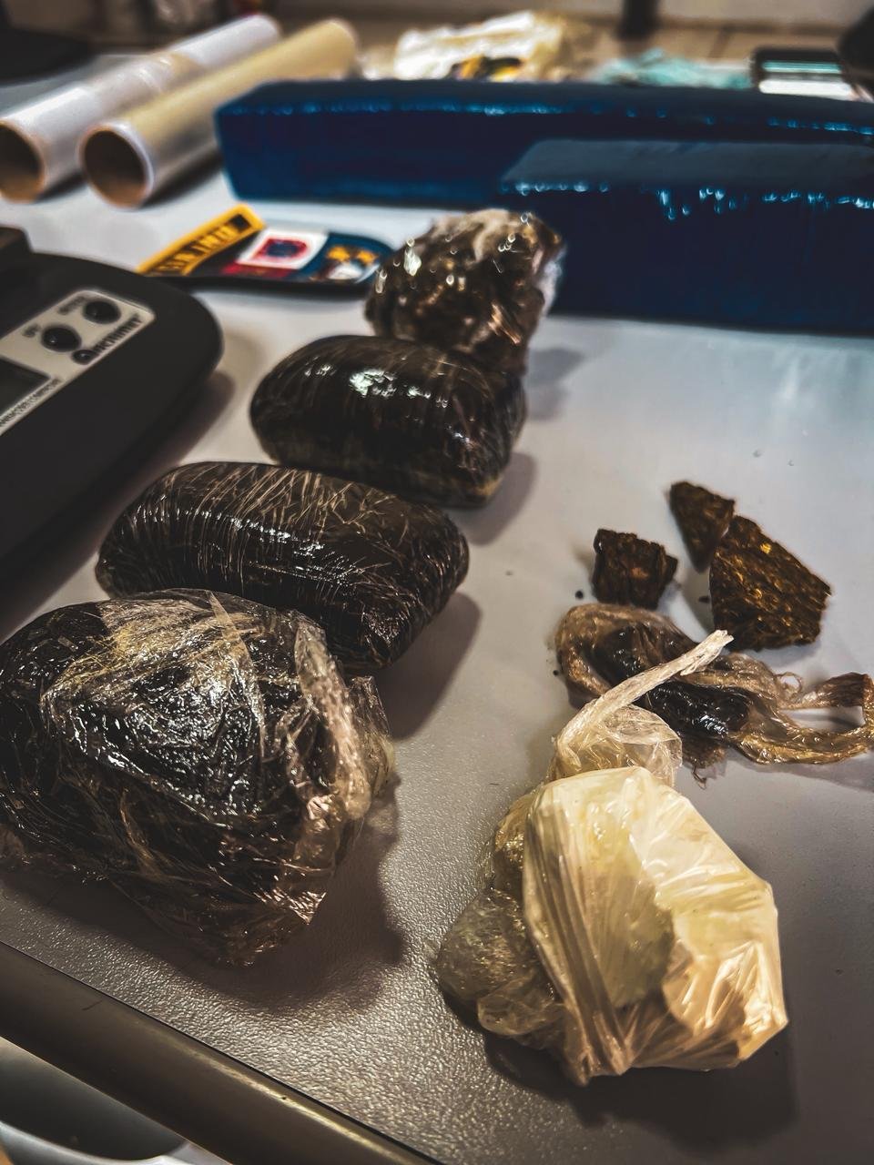 Na busca veicular, os policiais localizaram no banco traseiro uma sacola contendo diversas porções de substâncias análogas à cocaína e à maconha. Dentro do mesmo volume havia também uma garrafa de bebida alcoólica parcialmente consumida e um aparelho celular. O motorista relatou que a passageira já havia embarcado portando a sacola.