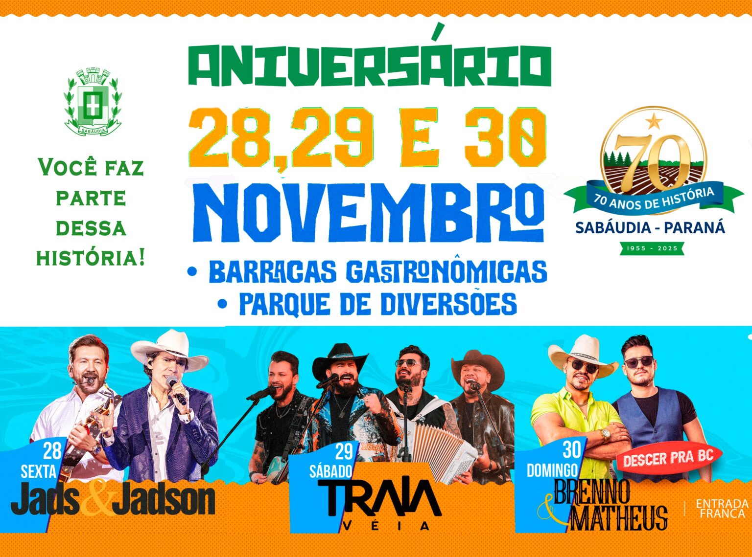 Com três shows nacionais e entrada gratuita, Sabáudia celebra seus 70 anos com uma programação especial entre os dias 28 e 30 de novembro. As atrações tomam conta da área central da cidade, em frente ao Paço Municipal, com música, celebrações religiosas, desfile cívico e uma ampla praça de alimentação.