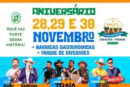 A ExpoArapongas é a celebração especial dos 78 anos do município, que vai agitar Arapongas e região. A Prefeitura de Arapongas convida a todos a prestigiar as diversas atividades. No terceiro dia, no sábado, 11, as atrações musicais. Os portões do Expoara serão abertos a partir das 14h, com a Praça de Alimentação (que estará aberta até o fim dos shows) e a Feira de Comércio e Serviços (até às 22h), uma parceria com a Associação Comercial e Empresarial de Arapongas (Acia). Os shows começam a partir das 20h30, com Igor Deoz. Ayala & Julio Cesar sobem ao palco às 22h; João Bosco & Vinícius às 23h30, e João Felipe & Murillo à 01h30 de domingo, 12.