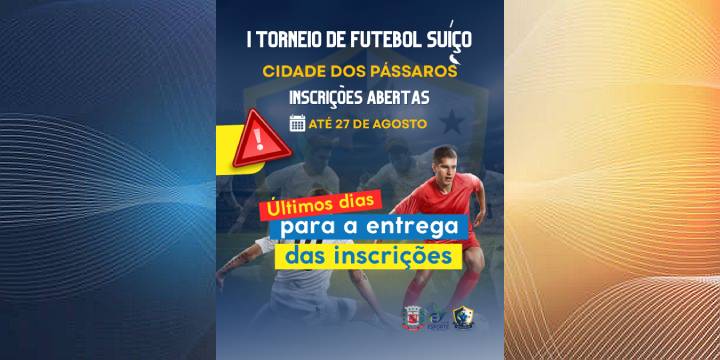 A Prefeitura do Município de Arapongas, por meio da Secretaria de Esporte, informa que seguem abertas as inscrições para a primeira edição do Torneio de Futebol Suíço Cidade dos Pássaros. O prazo termina nesta quarta-feira, 27, e o evento vai integrar as comemorações oficiais do aniversário do município, que será em outubro.